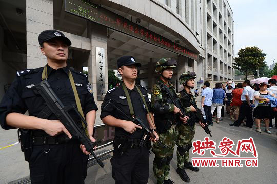 鄭州警方根據(jù)全市考區(qū)的實際情況進行了警力部署:市內每個考點安排轄區(qū)派出所民警6名、交巡警6名、特警4名;上街、中牟、滎陽、新鄭、新密、登封每個考點安排執(zhí)勤民警16名,其中:派出所民警6名、交警6名、特警4名。為全力服務考生,鄭州警方要求各單位執(zhí)勤民警在開考前1個小時到達指定崗位,認真履行各項職責,考試結束40分鐘后撤崗。對位于繁華路段、周邊治安復雜或交通擁堵路段的學校有針對性的增派警力,切實加強考點及周邊安全保衛(wèi)工作。