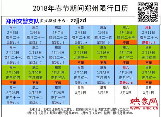 映象網(wǎng)訊(記者 秦雯)2018年春節(jié)長假從2月15日開始至2月21日結(jié)束,共7天,春節(jié)將至,為了確保在市民人流、車流、物流最密集的時段可以安全出行。2月5日,記者從鄭州市交警支隊了解到:2月15日至2月21日春節(jié)七天長假期間,鄭州市區(qū)三環(huán)以內(nèi)所有機動車尾號不限行,但2月11日(星期日)、2月24日(星期六)上班,因法定節(jié)假日放假調(diào)休而調(diào)整為上班的周六、周日,按對應(yīng)調(diào)休的工作日限行,因此2月11日(周日)按周四限行規(guī)定,限行尾號4和9;2月24日(周六)按周三限行規(guī)定,限行尾號3和8。