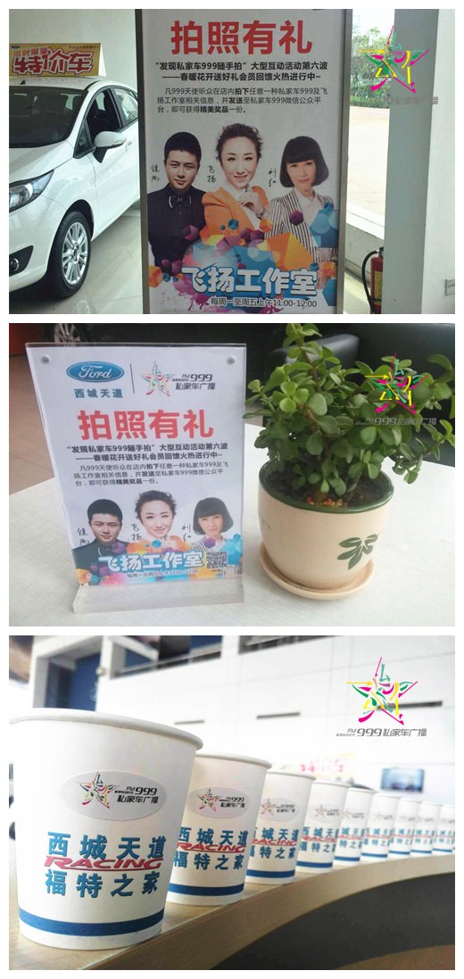 6月3日起至6月9日,凡999聽眾至聯(lián)盟商家店內(nèi)拍下私家車廣播logo以及“飛揚(yáng)工作室”任一相關(guān)信息,并發(fā)送關(guān)鍵詞“發(fā)現(xiàn)999”至我們微信公眾平臺,同時(shí)留下你的“姓名+電話”,前50位車友均可獲贈2升機(jī)油!