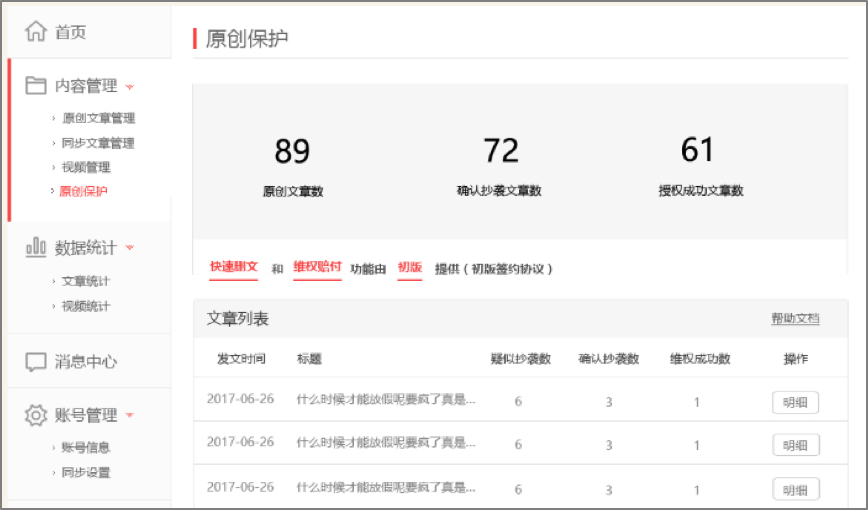 一點(diǎn)號(hào)、鳳凰號(hào)為自媒體用戶提供原創(chuàng)文章版權(quán)保護(hù)功能。 其中,鳳凰號(hào)將于月末開啟維權(quán)賠付功能,通過后臺(tái)監(jiān)測(cè)200+主流平臺(tái),對(duì)侵權(quán)抄襲行為一查到底替作者維權(quán)。未來一點(diǎn)號(hào)、鳳凰號(hào)將會(huì)全力打造原創(chuàng)優(yōu)質(zhì)內(nèi)容的版權(quán)保護(hù)平臺(tái)及監(jiān)測(cè)網(wǎng)絡(luò),對(duì)于站內(nèi)文章被站外的抄襲也會(huì)進(jìn)行相關(guān)維權(quán)工作。