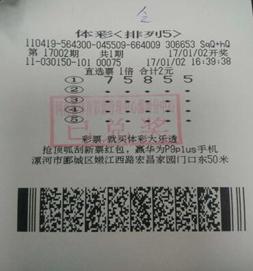 1月2日晚,第17002期排列五開獎(jiǎng),開獎(jiǎng)號(hào)碼是“75855”,漯河彩民喜中10萬元大獎(jiǎng)1注,這也是當(dāng)?shù)?017年第1注排列五大獎(jiǎng)。