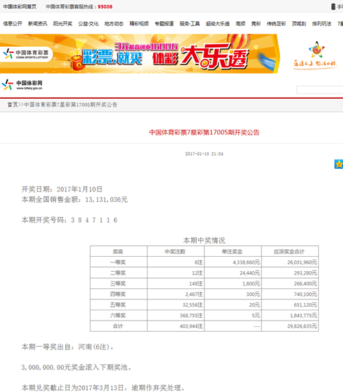 1月10日晚,七星彩第17005期開獎,開獎號碼為3847116。當(dāng)期全國中出一等獎6注,單注獎金433.86萬元,全部被河南彩民斬獲,總獎金2600余萬元,一次性掏空了全國獎池。