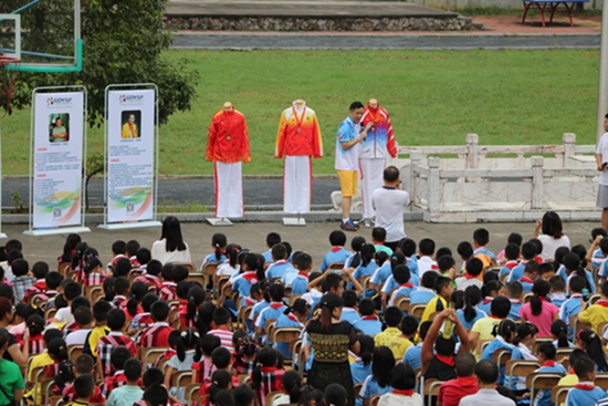 在建設(shè)美麗鄉(xiāng)村的社會背景下,“冠軍課堂”鄉(xiāng)村行是廣東省體彩中心、廣東省青少年體育聯(lián)合會對“公益體彩·快樂操場”活動的延伸,由國家級跳水教練、奧運冠軍教練胡恩勇帶領(lǐng)世界冠軍及優(yōu)秀運動員,歷時4個月,走進9地市的25 所山區(qū)中小學(xué)校,為那里的師生帶去體育器材,上一堂公益體育課,部分優(yōu)秀運動員還會在受助學(xué)校支教半年?;顒訛楹⒆觽儤淞⒘恕皭圻\動,強體魄”的觀念,讓缺少體育器材和專業(yè)體育教師的孩子們都能“每天快樂運動一小時”。