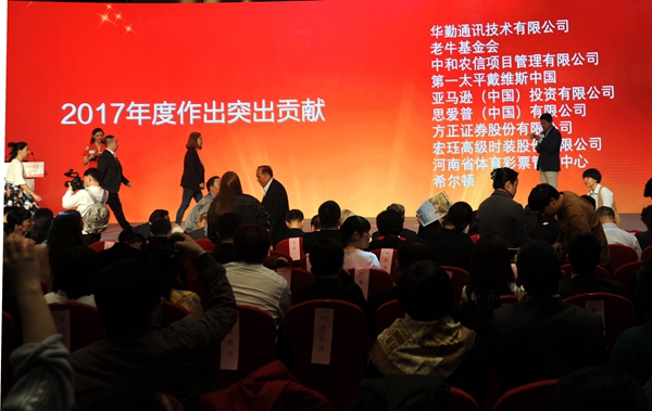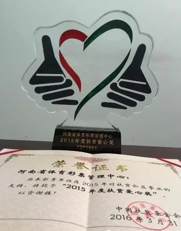 河南省體育彩票管理中心榮獲中國扶貧基金會“2017年度扶貧突出貢獻獎”,中心黨支部書記王海新代表單位領取了獎杯和證書。