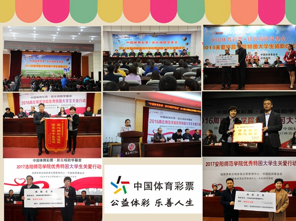河南省體育彩票管理中心自2013年開始,已經(jīng)連續(xù)五年通過國家體育總局體育彩票管理中心與中國扶貧基金會合作,以“中國體育彩票·新長城助學基金”形式,向信陽師范學院、河南師范大學、許昌學院、商丘師范學院、周口師范學院、洛陽師范學院、安陽師范學院共計7所院校的400名優(yōu)秀貧困大學生累計捐助助學金200萬元。2015年,河南體彩中心在前兩年每年捐助50名貧困大學生的基礎上,將受助名額增加到了60名,2016年開始又將捐贈學校從一所增加到兩所,受助學生名額從60名又增加到120名,每個學生的受助金額從4000元提高到了5000元,希望幫助更多的困難學生及其家庭減輕經(jīng)濟負擔和精神壓力。