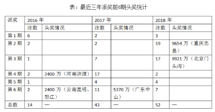 在前6期派獎中,頭獎井噴52注,單注最高獎金為2215萬元,單人最高擒獎9921萬元,共爆出2個(gè)近億元大獎。