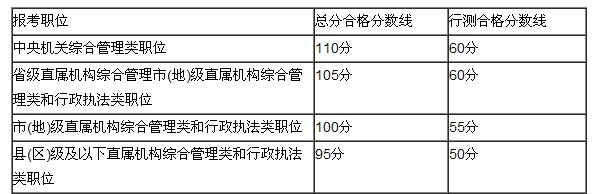 其中,報(bào)考中央機(jī)關(guān)綜合管理類職位的合格分?jǐn)?shù)線較去年相比有所提高,總分不低于110分,且行政職業(yè)能力測(cè)驗(yàn)不低于60分。分?jǐn)?shù)線劃定如下表: