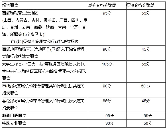 其中,西部地區(qū)和艱苦邊遠(yuǎn)地區(qū)綜合管理類和行政執(zhí)法類職位的合格分?jǐn)?shù)線總分不低于95分,且行測(cè)不低于55分。非通用語(yǔ)職位的合格分?jǐn)?shù)線總分不低于95分,且行測(cè)不低于55分。特殊專業(yè)職位的合格分?jǐn)?shù)線總分不低于90分,且行測(cè)不低于50分。銀監(jiān)會(huì)、證監(jiān)會(huì)特殊專業(yè)職位專業(yè)科目考試不低于50分。
