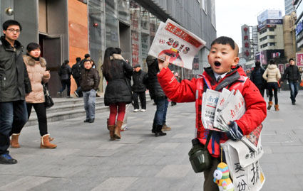 元旦小長假第二天,寒風(fēng)凜冽,氣溫降到-5℃。南京新街口地鐵口川流不息的人流中,一個(gè)身穿紅色外套,背著青奧吉祥物“砳砳”的小男孩格外引人注目。他背著一只碩大口袋,報(bào)袋上印有“賣一份報(bào)紙捐一毛錢”字樣,一邊走一邊叫,“賣報(bào),賣報(bào)——”他就是去年大年夜一祼成名的裸跑弟多多,這是他的鷹爸在對他進(jìn)行財(cái)商訓(xùn)練。據(jù)悉,這是鷹式教育“十商并舉”中的重要一環(huán)。