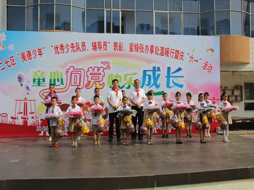 5月31日,二七區(qū) “星級美德少年”、“認(rèn)星爭優(yōu)”活動(dòng)優(yōu)秀學(xué)校、優(yōu)秀教師、優(yōu)秀家長、“十佳少先大隊(duì)”、“十佳少先隊(duì)干”、 “十佳少先隊(duì)輔導(dǎo)員”、“百佳少先隊(duì)員”頒獎(jiǎng)儀式、蜜蜂張辦事處溫暖行暨慶“六一”活動(dòng)在鄭州市二七區(qū)京廣路小學(xué)舉行。