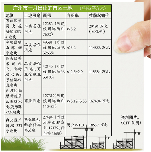 而根據(jù)以往數(shù)據(jù),廣州1月底即將入市的土地達到7宗,總起拍價高達55.8億元,其中有五宗地位于中心城區(qū),備受關注。記者發(fā)現(xiàn),去年1月廣州土地出讓金僅為13.6億元。若以起拍價計算,廣州今年1月拍地收入將達到去年同期4倍。