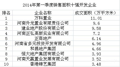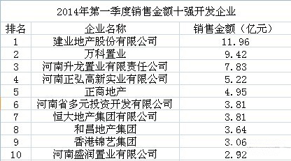 建業(yè)地產(chǎn)股份有限公司以11.96億元的銷售金額高居榜首,成為2013年一季度商品住宅企業(yè)銷售金額冠軍。萬科置業(yè)、河南升龍置業(yè)以9.42億元和7.83億元緊隨其后,分列亞軍和季軍。第四至第十名為河南正弘高新實(shí)業(yè)有限公司(5.22億元)、正商地產(chǎn)(4.95億元)、河南省多元投資開發(fā)有限公司(3.81億元)、恒大地產(chǎn)集團(tuán)有限公司(3.81億元)、和昌地產(chǎn)集團(tuán)(3.64億元)、香港錦藝集團(tuán)(3.06億元)、河南盛潤置業(yè)有限公司(2.92億元)。