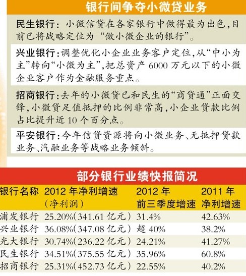其中一個重要的對手將是興業(yè)銀行。興業(yè)銀行昨日披露,2013年,興業(yè)銀行積極調(diào)整優(yōu)化小企業(yè)業(yè)務(wù)客戶定位、經(jīng)營戰(zhàn)略和發(fā)展目標(biāo),將總資產(chǎn)6000萬元以下的小微企業(yè)客戶作為金融服務(wù)重點,并配套實施一系列體制機制改革措施和投入資源保障,全面推進小微企業(yè)金融服務(wù)升級。