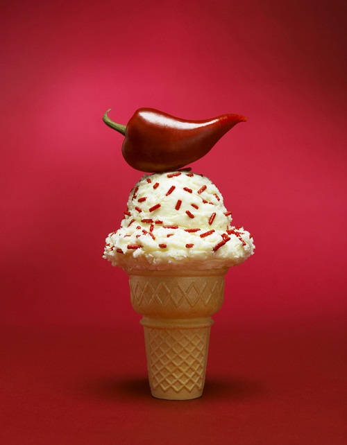 辣椒冰淇淋是墨西哥獨有的口味。點一杯冰淇淋,小販麻利地抄起一個辣椒杯,迅速往里舀了三大勺冰淇淋球,口味很多種:巧克力、香草、檸檬、草莓、咖啡等,上面還會加芒果、草莓、甜瓜等水果,不過這些都不是主角,涂滿杯壁的紅色辣椒醬,才是味覺的中心。這種紅色的辣椒醬,一般由辣椒面、鹽、醋和糖調(diào)制而成,滋味如同配料一樣,酸甜辣咸融為一體。裝好冰淇淋,小販還會在杯子里插一個辣椒棒棒糖,一來可以增加口味,二來還能當勺用。小攤上還擺著自助調(diào)料臺,很多墨西哥人嫌滋味不夠,還會再加辣椒醬,撒辣椒鹽或是擠檸檬汁。