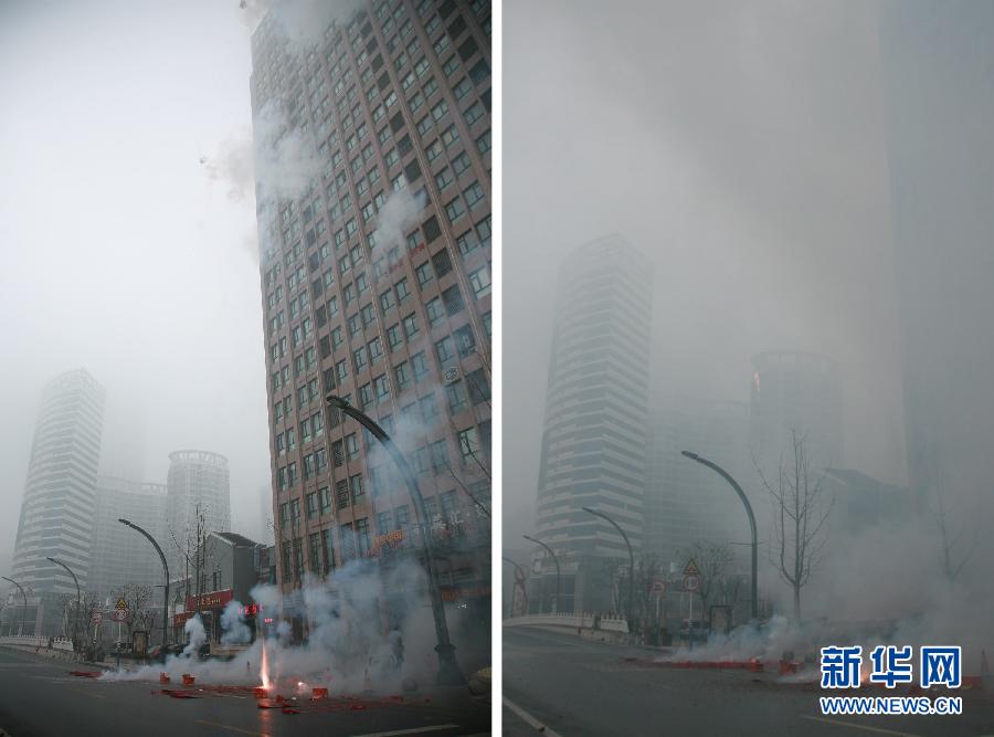 這張照片顯示的是,2月14日,在江蘇南通一高樓前,商家燃放“開門炮”(左圖);2月14日,燃放開門炮后,空氣透明度迅速下降(右)。當日是大年初五,我國民間有初五迎財神的習俗,一些商家也會選擇這一天燃放“開門炮”迎財神,重新開業(yè)?!伴_門炮”鞭炮齊鳴的同時,也加重了空氣污染?! ⌒氯A社發(fā)(徐培欽 攝)