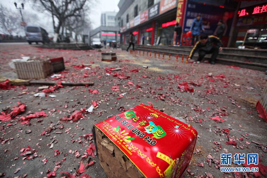 2月14日,江蘇南通,商家燃放“開門炮”后煙塵彌漫,一名回收廢紙的工人收走煙花爆竹燃放后留下的硬紙盒。當日是大年初五,我國民間有初五迎財神的習俗,一些商家也會選擇這一天燃放“開門炮”迎財神,重新開業(yè)。“開門炮”鞭炮齊鳴的同時,也加重了空氣污染?! ⌒氯A社發(fā)(徐培欽 攝)