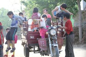 三輪摩托車開進(jìn)鄭開大道南邊的一個村子停了下來。此時,我才發(fā)現(xiàn)真正在駕駛?cè)喣ν熊嚨氖且晃恢心陭D女,那個貌似在開車的小女孩就坐在三輪摩托車的油箱上。為了看清道路,中年婦女不得不歪著腦袋開車。車子停下時,車上的孩子們紛紛跳下車向家中跑去。