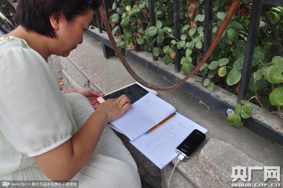 傘下,一名拿著平板電腦蹲在地上的女士在幫李俊強(qiáng)進(jìn)行微信募捐。這名愛(ài)心人士叫左微,是一集團(tuán)公司的負(fù)責(zé)人,21日看到東方今報(bào)“賣(mài)水爸爸”的報(bào)道后,她在微信群里發(fā)起“一瓶水”公益,22日募集3200元,23日上午募集5600多元。