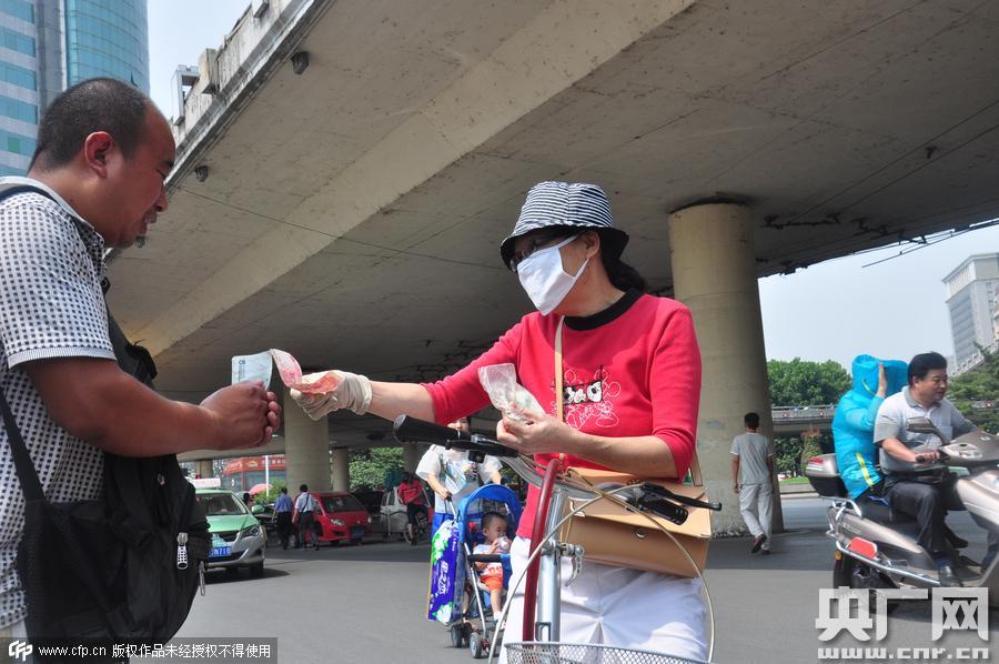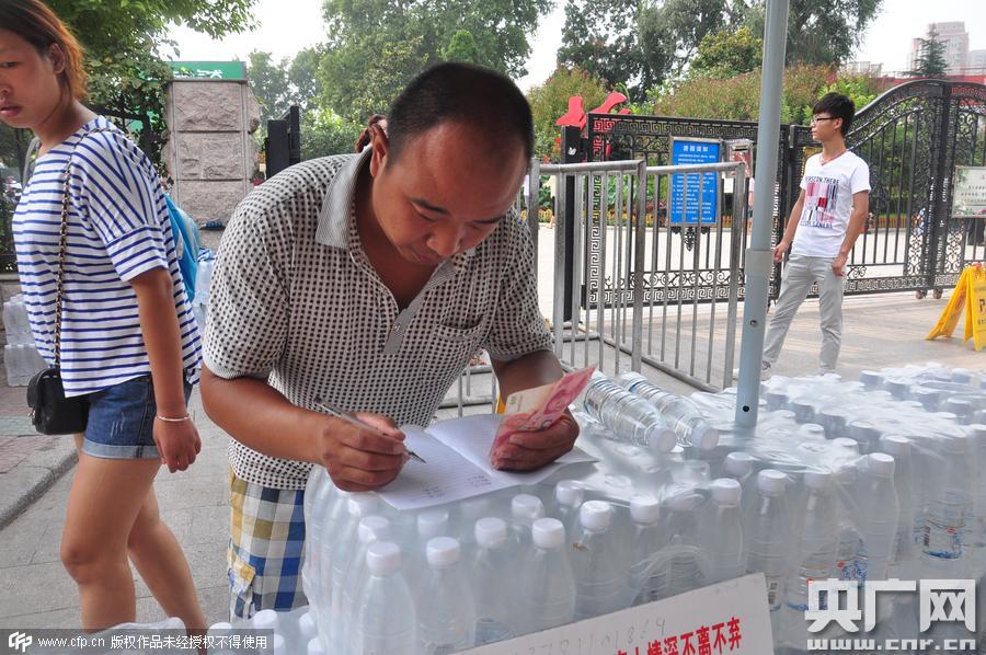 2015年8月23日,河南鄭州,“賣(mài)水爸爸”李俊強(qiáng)街頭籌善款給女兒治病。 市民捐款