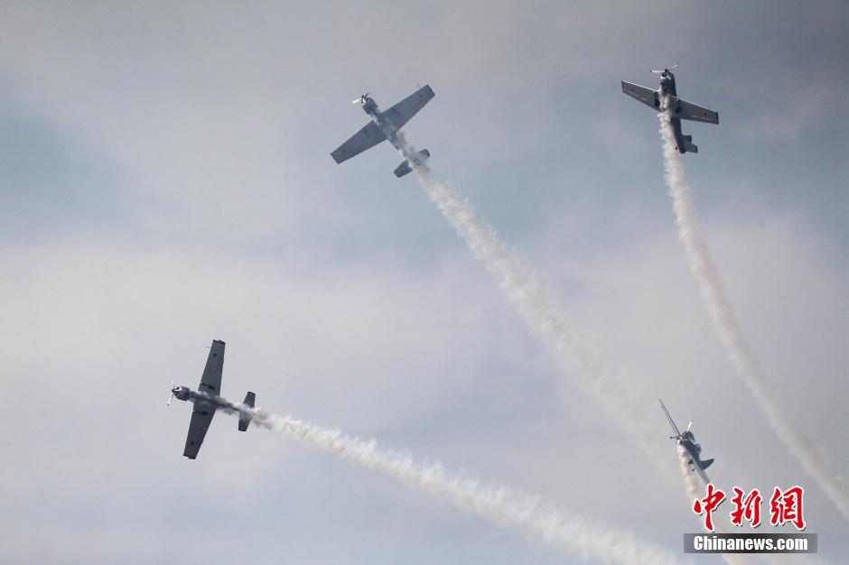 9月24日,河南鄭州上街機(jī)場,參加2015鄭州航展的特技飛行員們,穿云破霧在加緊練習(xí)表演動(dòng)作,沖刺9月25日開幕的鄭州航展。中新社記者 王中舉 攝