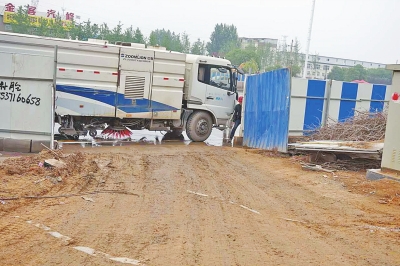 為了查個(gè)究竟,吳師傅等人順著泥印從路口向北尋找,很快找到路口北約150米路東側(cè)的一家工地。此時(shí),仍有工程車(chē)和渣土車(chē)不斷從工地駛出。由于這些車(chē)的輪胎上粘滿泥巴,駛上馬路后,大量泥巴遺落在路面上,留下一道道黃泥印?!拔覀兊焦さ赜懻f(shuō)法,卻無(wú)人照頭。”樊師傅說(shuō),上午9時(shí)30分,他們一氣之下,用一輛清掃車(chē)堵在工地大門(mén)口,以此阻擋工地上的施工車(chē)輛出門(mén)(如圖)。