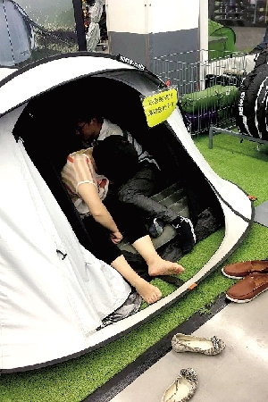 除此之外,戶外用品區(qū)也成為最受歡迎的展品區(qū)。因?yàn)檫@里擺放的大量戶外用品,如帳篷、充氣床、釣魚(yú)折疊椅等,都能供客人休息,很多一家三口在此休息。