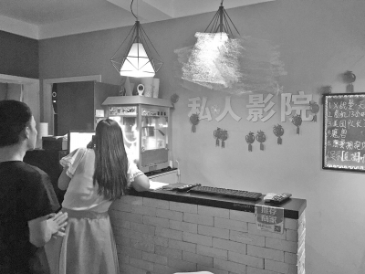 “影院的小包間適合2~4人,大的最多可坐8人?!蓖砩?0點(diǎn),所設(shè)5個包間已全部滿員,包間都為不帶窗木門,均可反鎖?!昂蛴皬d”內(nèi)設(shè)置有新片推介板、爆米花機(jī)和各式酒水,不少年輕男女正排隊(duì)等待觀影。