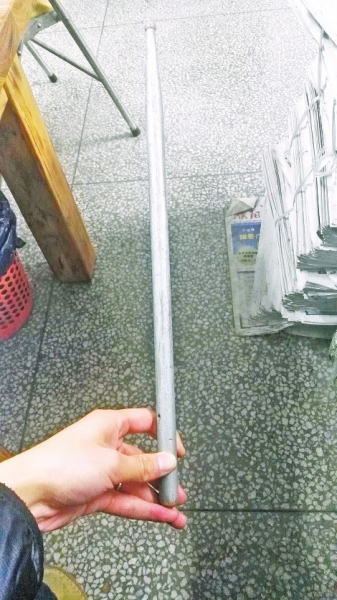 隨后,記者見到了校方提供的打?qū)W生的工具,是一個(gè)鼓槌,外表涂有銀色的漆,看起來像是鐵質(zhì)的,校方稱學(xué)校沒有鋼管類的教鞭等。