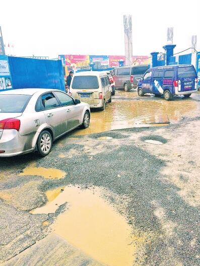 鄭州農(nóng)業(yè)路與沙口路附近的保通路上,交叉口東西兩側(cè)各有一處較大的深坑。西側(cè)一處深約20厘米,不少電動(dòng)車主行至坑邊,不敢涉水通過,只能擠進(jìn)快車道行駛,非常危險(xiǎn);東側(cè)一處大坑面積約60平方米,水坑最深處可達(dá)30厘米,私家車從此經(jīng)過,濺起一片水花。該大坑正處一個(gè)丁字路口正中央,且沙口路、農(nóng)業(yè)路的車輛僅有此處一條通道,因車輛通行緩慢,路面私家車排起一條長龍。