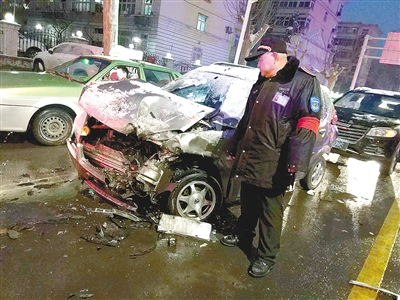 日暮雪大,路上結冰,一輛雪鐵龍由北向南行駛,撞上兩輛汽車與一輛公交車,雪鐵龍轎車司機滿身酒氣,被警方帶去醫(yī)院抽血取證。