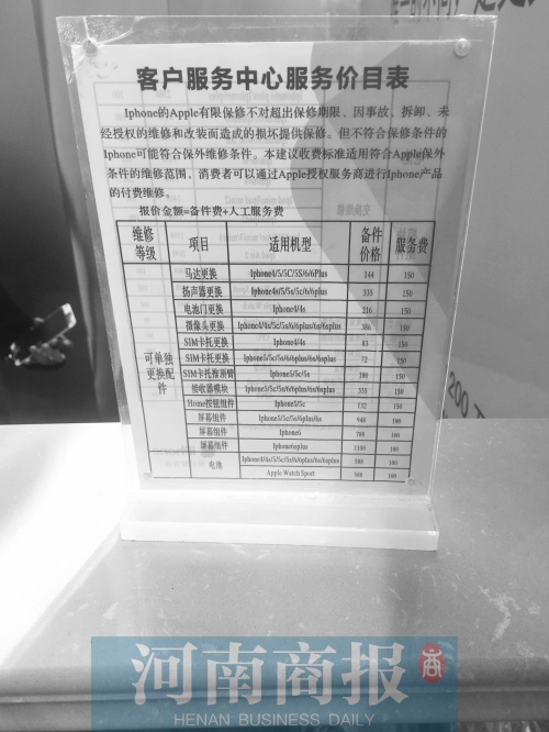 拿蘋果6S更換屏幕來說,這里標(biāo)價1200元,而河南商報記者在文化路、隴海路等手機維修點了解到,維修費用四五百元即可。