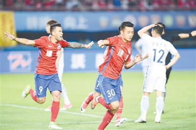 建業(yè)隊員慶祝進球 記者 李 焱 攝