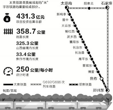 太焦鐵路是我省規(guī)劃的“米”字形鐵路的重要組成部分,項目投資估算總額為431.3億元,線路長度358.7公里,其中山西省境內(nèi)325.3公里,我省焦作市境內(nèi)33.4公里。工程計劃建設(shè)周期為5年,設(shè)計時速為每小時250公里。全線設(shè)太原南、新鳴李、晉中、太谷東、榆社西、武鄉(xiāng)西、襄垣東、長治東、長治縣、高平東、晉城東、博愛及焦作13個車站。