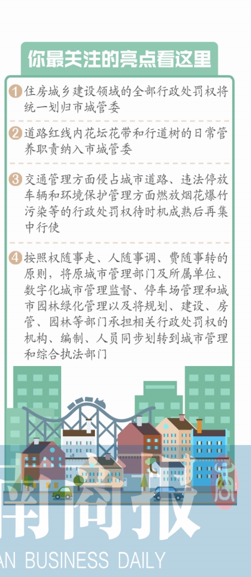 按照權隨事走、人隨事調、費隨事轉的原則,將原城市管理部門及所屬單位、數(shù)字化城市管理監(jiān)督、停車場管理和城市園林綠化管理涉及的機構、編制、人員同步劃轉到城市管理和綜合執(zhí)法部門;將規(guī)劃、建設、房管、園林等部門承擔相關行政處罰權的機構、編制、人員同步劃轉到城市管理和綜合執(zhí)法部門。