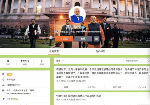 據(jù)媒體報道,莫迪計劃于本月訪問中國。他也成為又一位開展“微博外交”的外國國家領(lǐng)導(dǎo)人。此前,已經(jīng)有4個國家的領(lǐng)導(dǎo)人開通了新浪微博,其中澳大利亞前總理陸克文是第一位,委內(nèi)瑞拉總統(tǒng)尼古拉斯·馬杜羅和英國首相卡梅倫均在2013年開了微博,以色列前總統(tǒng)西蒙·佩雷斯于2014年開通。