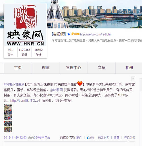 “老漢錢被盜,鄭州市民網(wǎng)友義買粉條”微博發(fā)布于2013年11月19日,當天,映象網(wǎng)記者在街頭采訪,偶遇中牟縣的一位農(nóng)家老漢與老伴到鄭州賣粉條,不料騾子被偷,錢也被盜。映象網(wǎng)迅速發(fā)布新聞,并連續(xù)發(fā)布多條微博,呼吁市民網(wǎng)友伸出援手幫助兩位老人,迅速引發(fā)關(guān)注,短時間內(nèi)轉(zhuǎn)發(fā)量超過200次,閱讀量接近20萬次,引發(fā)眾多愛心市民網(wǎng)友前往購買粉條,400多斤粉條在兩個小時內(nèi)被搶購一空,丟失的騾子也成功找回。