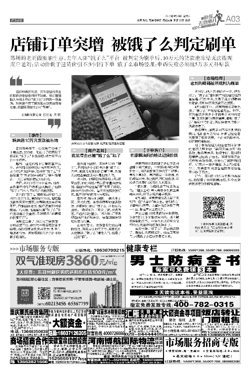 4月16日,《河南商報》以《店鋪訂單突增 被餓了么判定刷單》為題,對老劉10萬多元的交易款被凍結(jié)一事進(jìn)行報道,“餓了么”市場經(jīng)理潘先生稱,因?yàn)檫B續(xù)多天多個手機(jī)號在老劉店鋪下單,系統(tǒng)判斷為商家刷單,套取“餓了么”給用戶的補(bǔ)貼,所以將老劉的賬戶貨款凍結(jié)了。