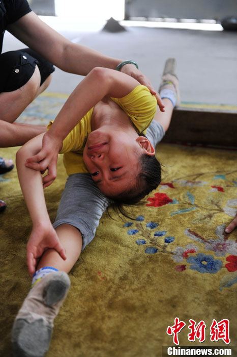 在練高難度動(dòng)作時(shí),小秀華強(qiáng)忍痛苦,沒(méi)有喊出聲音,只是默默的留下眼淚。王東明 攝