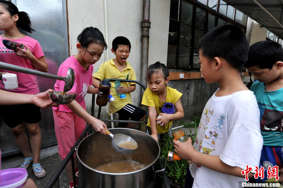 由于是團(tuán)里最小的學(xué)員,小秀華很懂禮貌,都讓哥哥姐姐先盛綠豆湯。王東明 攝