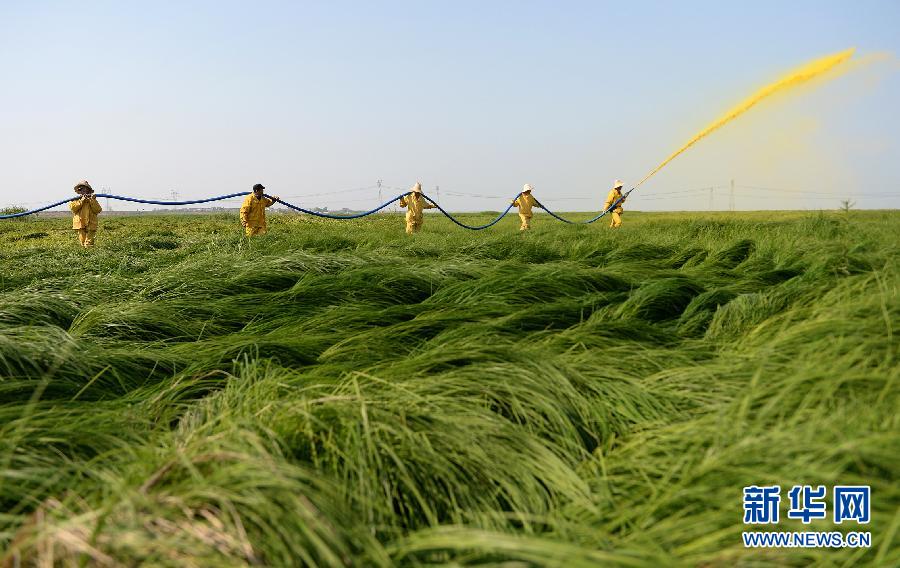 滅螺隊(duì)隊(duì)員在草洲上查螺(4月14日攝)。 新華社記者 萬象 攝