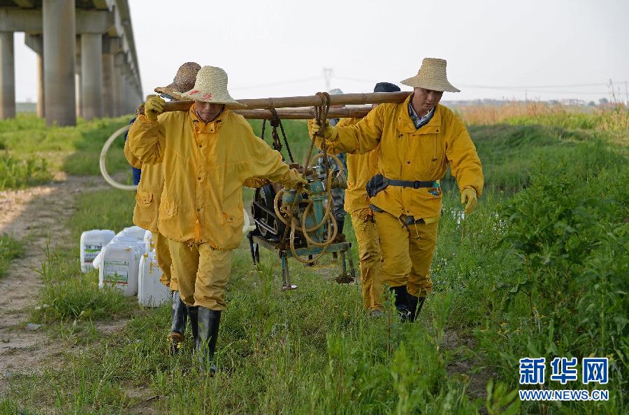 滅螺隊(duì)隊(duì)員扛著150米的皮管對重點(diǎn)地區(qū)進(jìn)行藥物滅螺(4月14日攝)。