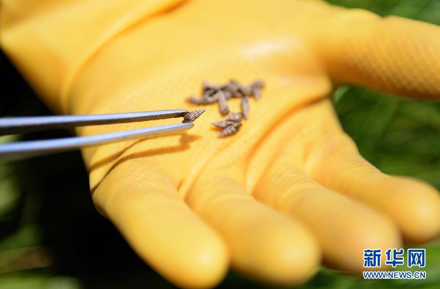 滅螺隊(duì)員在查看收集到的釘螺(4月14日攝)。 新華社記者 萬象 攝