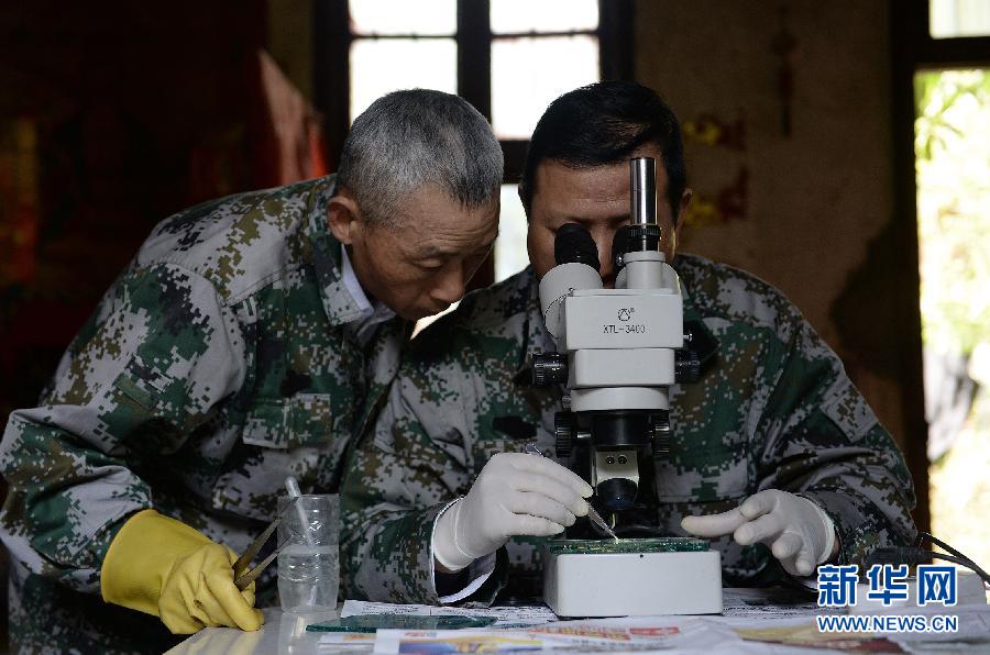 在租住當(dāng)?shù)剞r(nóng)民的房子里,滅螺隊(duì)員熊林根(右)用顯微鏡觀察當(dāng)天收集的釘螺樣本(4月14日攝)。 新華社記者 萬象 攝