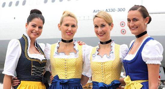 漢莎公司空姐2005年改穿這種巴伐利亞傳統(tǒng)制服,當時恰逢每年一度的慕尼黑啤酒節(jié)。2014年,漢莎公司從慕尼黑前往北京、圣保羅以及墨西哥城的長途航班上,乘務員都穿起傳統(tǒng)服裝??战愦S色緊身衣,上面印有藍花,配上藍白相間的裙子。