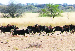 沒有交談,沒有笑聲,保持著靜默的狀態(tài),連越野車也盡量壓抑著發(fā)動機(jī)的聲音,我們緩慢地向一群牛羚靠近。這幫家伙可是好不容易才安靜下來的,在遠(yuǎn)距離上,不等動物完全靜止下來是很難打中的,剛才的一槍就放空了,驚嚇得它們奔跑了好久。
