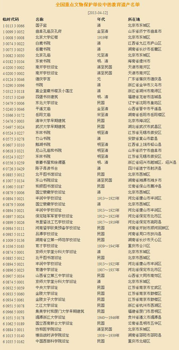 我國作為歷史悠久的文明古國,教育的傳統(tǒng)源遠(yuǎn)流長,春秋私學(xué)即興;此后官學(xué)、私學(xué)交織發(fā)展,在歷史上形成“學(xué)校如林、庠序盈門”的景象,給后世留下了極為豐富的教育遺產(chǎn)。僅在國務(wù)院批準(zhǔn)的全國重點文物保護(hù)單位當(dāng)中,就有 “國子監(jiān)”“孔廟”“白鹿書院”“岳麓書院”“北京大學(xué)紅樓”等相關(guān)教育遺產(chǎn)六十余處。它們不僅具有文物建筑本身的歷史、科學(xué)、美術(shù)、文化等各方面的價值,而且承載、見證了中華民族優(yōu)秀的文化教育傳統(tǒng),促進(jìn)了各個時代的精神文化建設(shè)。因此,提出并深入研究教育的遺產(chǎn),不僅有利于豐富歷史文化遺產(chǎn)的內(nèi)容,而且有利于進(jìn)一步細(xì)分文化遺產(chǎn)類型、豐富世界文化遺產(chǎn)的多樣性。