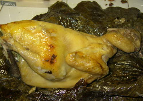 先將雞去腳爪肋下取臟,將腿、翅、頸骨入壇,加醬油、紹酒、精鹽腌漬一小時(shí),取出,將丁香、八角碾末,加山奈遍抹雞身,炒鍋入熟豬油,炸蔥、姜起香后撈去,再將蝦仁,雞肫丁、香菇丁、豬肉、火腿丁、蝦米入炒鍋顛炒幾下,加紹酒、醬油、白糖炒至斷生,待涼后塞入雞腹,放丁香并用豬網(wǎng)油包緊雞身,外用鮮荷葉包裹數(shù)層用細(xì)麻繩扎緊,把酒壇泥碾成粉加清水拌和起粘平攤濕布上,把雞置泥中間用濕布兜起,使泥緊粘揭去濕布,用包裝紙包裹,再戳一小孔,將雞裝入烤箱,旺火烤約40分鐘取出,用濕酒壇泥封孔再烤半小時(shí),用小文火烤80分鐘,再用微火烤90分鐘,取出敲去泥,去強(qiáng),荷葉裝盤(pán),淋芝麻油即成。