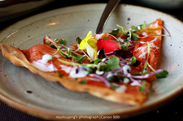 ▼酥酥薄薄的比薩,鋪上蕃茄,嫩芽和花瓣,佐上特有的酸奶醬,味道非常獨(dú)特。