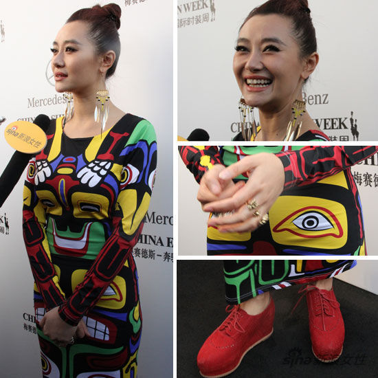 中國國際時裝周啟動儀式,愛戴一襲民族風(fēng)緊身長裙秀纖細(xì)小蠻腰,搭配了大紅色的休閑鞋,梳起了俏皮的丸子頭,在配上流蘇項鏈和金屬朋克風(fēng)的戒指首飾,整身表達(dá)了周末輕松愉悅的心情,同時花花綠綠的出街,又很吸引人眼球。