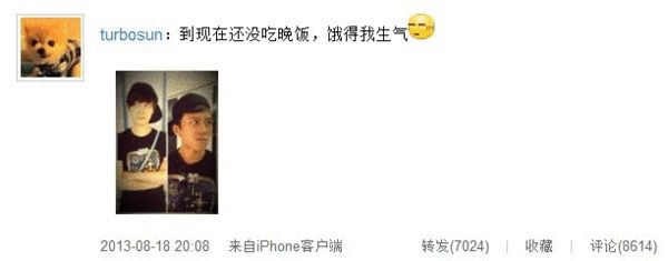 8月18日20點(diǎn)08分,孫儷通過(guò)微博曬和鄧超同傳情侶裝的照片,并稱:“到現(xiàn)在還沒(méi)吃晚飯,餓得我生氣!”照片中,兩人身穿黑色T恤情侶裝,很默契的把鴨舌帽的帽檐戴在后面,夫妻二人都歪眼斜視,橫眉冷對(duì),看上去似有仇一樣。